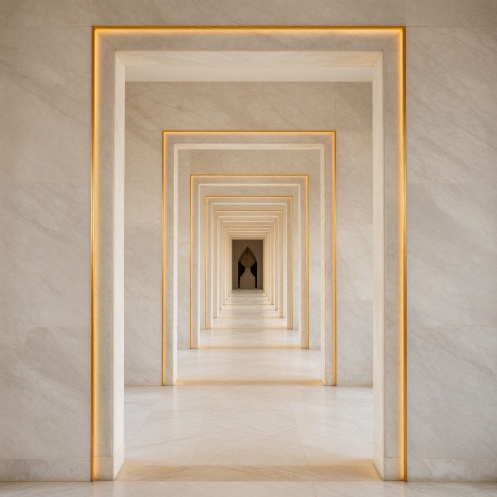 Elegant marble corridors extend infinitely, framed by glowing golden lines that guide the eye through a mesmerizing sequence of diminishing doorways, creating a hypnotic perspective of endless depth and symmetry.