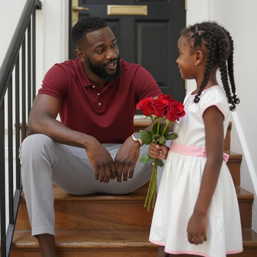 A photograph of a black man with a beard in a red shirt and striped pants sitting on wooden stairs, talking to a young black girl with braided hair in a white dress with pink accents, holding red roses. Dark wooden door in the background. Man has a relaxed expression, girl smiles at him. Black iron railing on the left.
