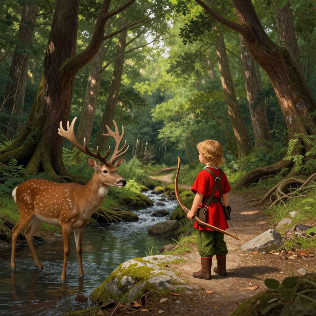 In a lush, verdant forest, a young child, clad in a vibrant red tunic and green pants, stands on a rocky path, holding a bow and arrow. The child's attire is adorned with various straps and pouches, suggesting readiness for a hunt. To the left, a majestic deer with antlers peers curiously into the stream, its fur a rich brown that blends with the earthy tones of the forest. The stream, a serene body of water, meanders through the scene, reflecting the dappled sunlight filtering through the canopy of trees. The forest itself is a dense tapestry of green, with large, gnarled trees and sprawling roots creating a sense of depth and mystery. The overall composition is balanced, with the child and deer positioned in the foreground, drawing the viewer's eye into the heart of the forest, where the path disappears into the shadows, inviting exploration. The art style is reminiscent of the detailed, imaginative works of artists like Clyde Caldwell, Larry Elmore, Jeff Easley, Keith Parkinson, Daniel R. Horne, Jason Chan, Zoltan Boros, and John Howe, characterized by rich textures, vibrant colors, and a sense of adventure.