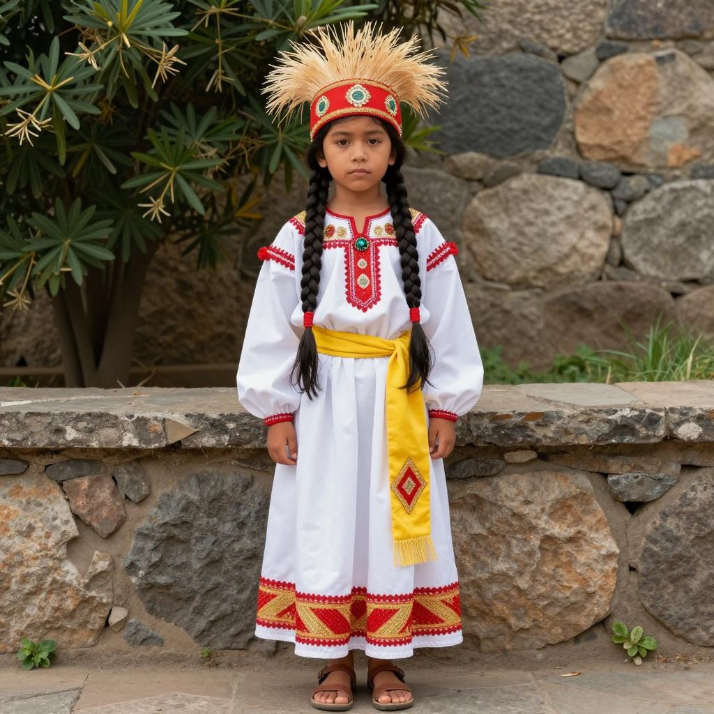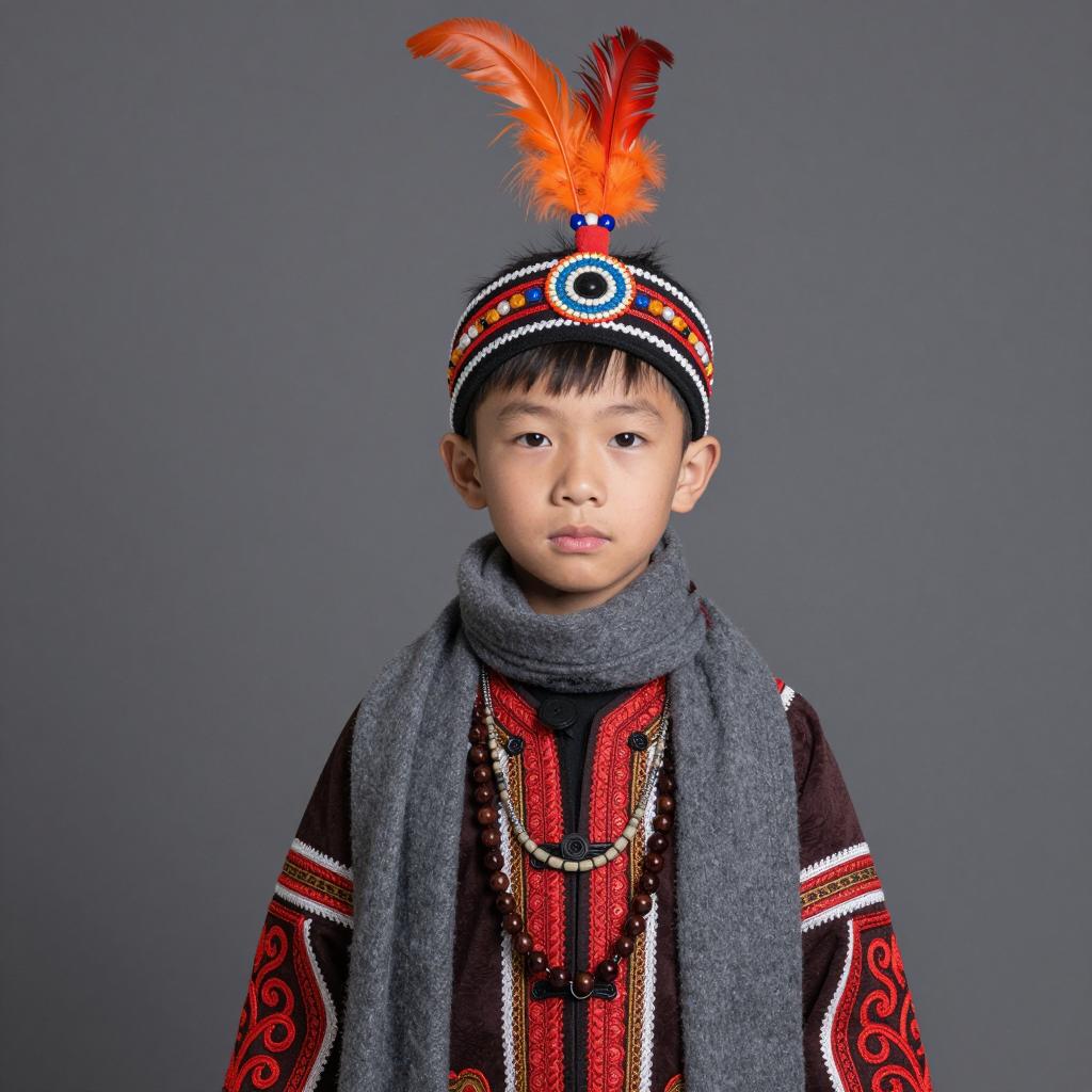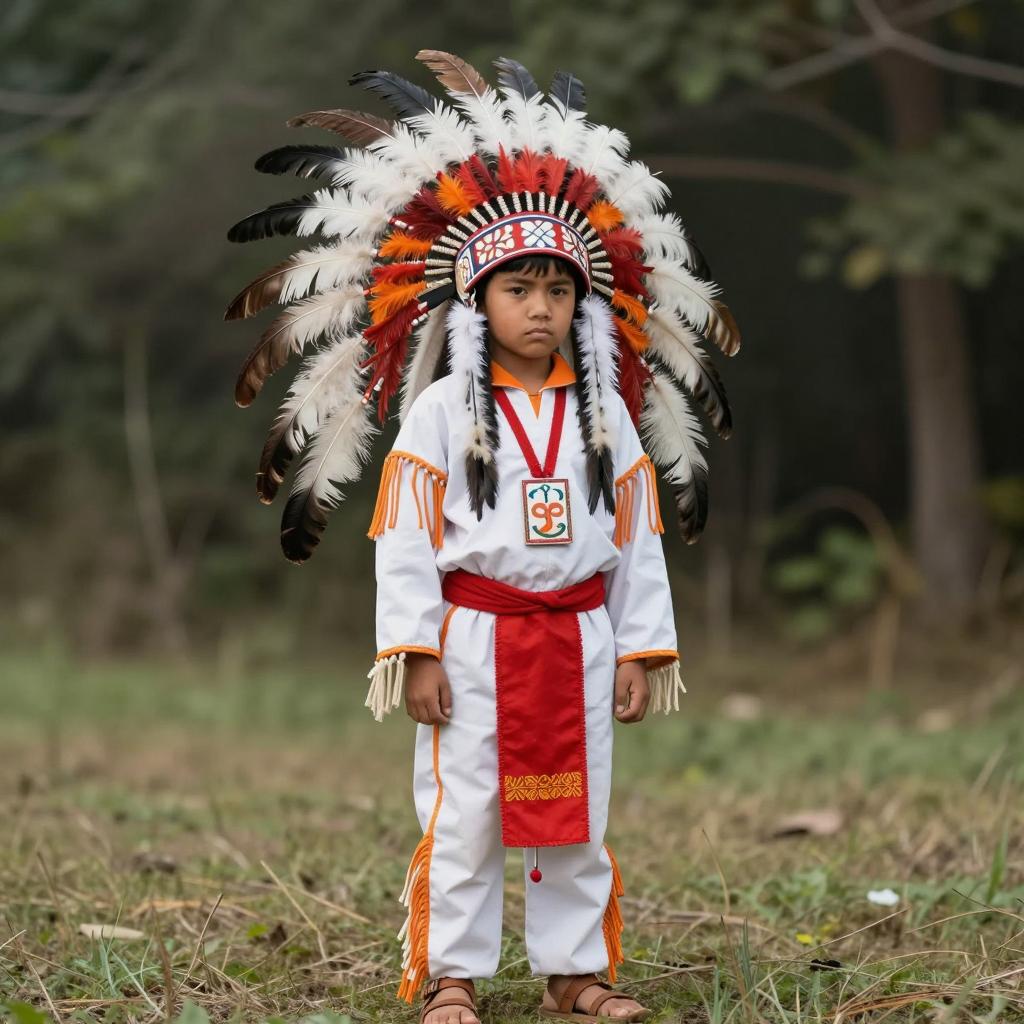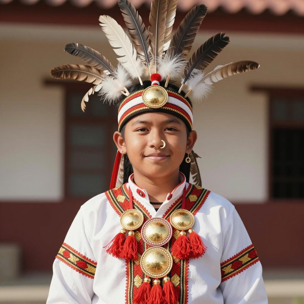 Filipino tribal costume, photograph of a young boy, traditional Native American headdress, tall beige and brown feathers, white tunic with red and gold embroidery, large decorative necklace with circular gold pieces and red tassels, small gold nose ring, earrings, standing in front of a building, sunny daylight, slight smile, ethnic attire, cultural clothing, medium close-up, warm colors, detailed ures, traditional headwear, indigenous fashion, heritage outfit
