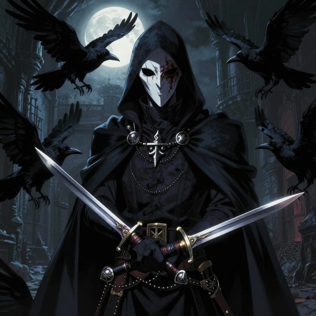 Digital artwork of a hooded, masked figure with glowing red eyes, holding two swords, surrounded by black ravens, under a full moon in a