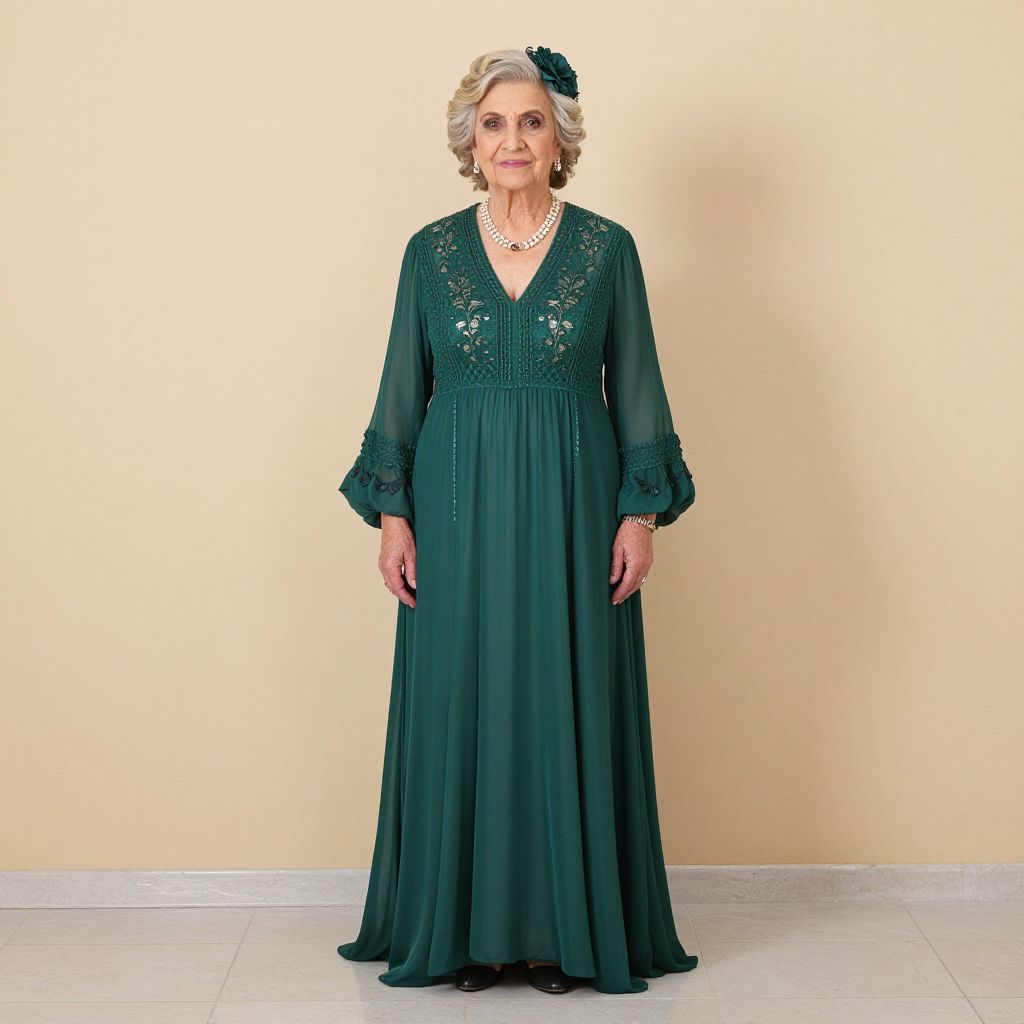 Photograph of an elderly woman with short, wavy, gray hair adorned with a black flower. She wears a long, dark green, lace-trimmed dress with three-quarter sleeves and a V-neck, embellished with intricate floral patterns. A white pearl necklace complements her outfit. She stands against a plain, beige wall and white-tiled floor, facing the camera with a gentle smile. Her skin is fair, and she exudes elegance and grace. The lighting is bright, highlighting the textures and details of her dress.