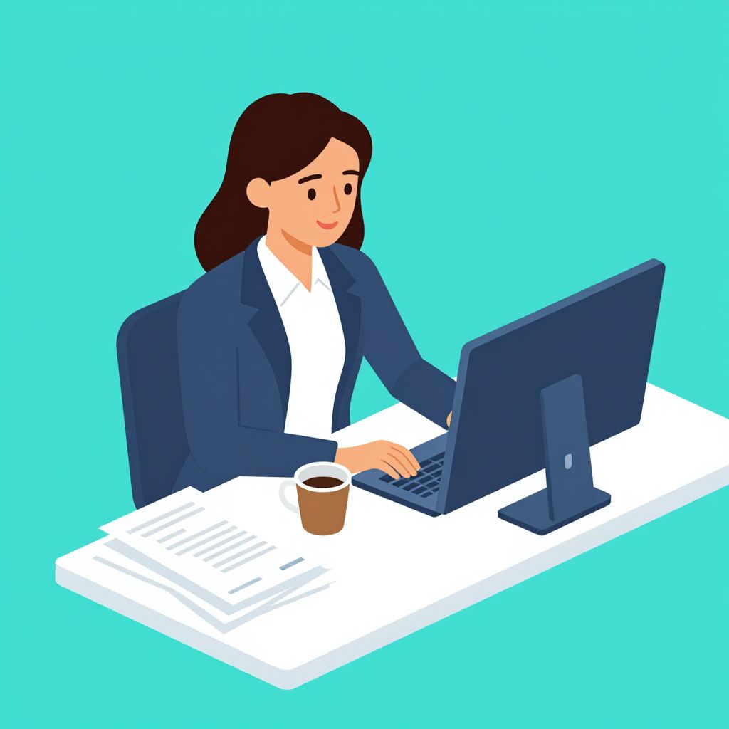 Digital illustration of a brown-haired woman in a blue blazer, white shirt, typing on a laptop, with a coffee cup on a desk, against