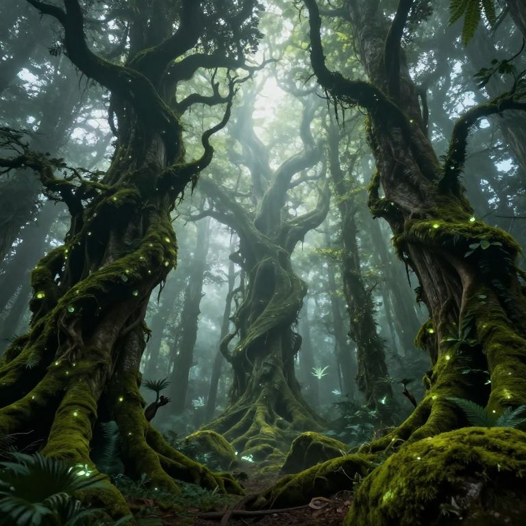 Veyr, an ancient enchanted forest filled with towering, twisted trees wrapped in glowing moss, mystical creatures peeking from behind rocks, and soft rays of light filtering through a foggy canopy, creating a magical and ethereal atmosphere.