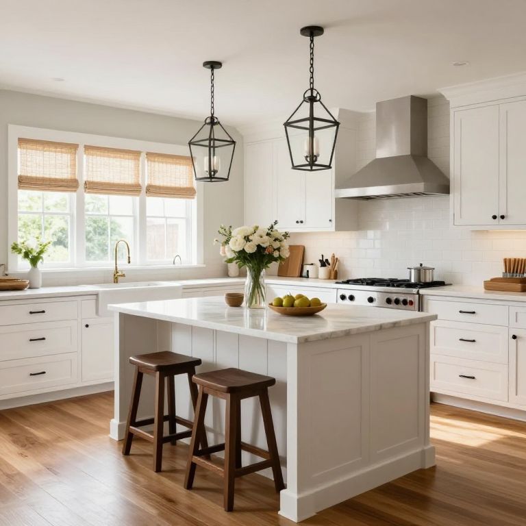 Contemporary Cottage Style Kitchen: A spacious summer cottage kitchen featuring white cabinetry with black hardware, a central island with a marble countertop and two dark wooden stools, pendant lantern-style lighting above, and natural light streaming through windows dressed with woven shades, complemented by floral arrangements and a warm hardwood floor.