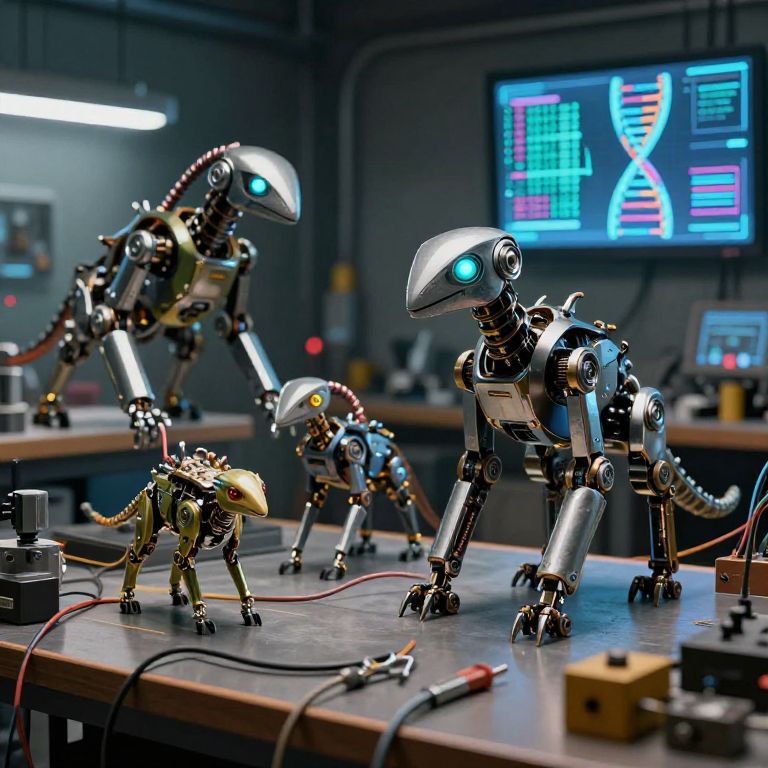 Photograph of a futuristic laboratory scene featuring four metallic, robotic quadrupedal creatures with glowing blue eyes and sleek, silver bodies. They are standing on a dark gray workbench with wires connecting them. The background includes a blurred, lit-up computer screen displaying a DNA double helix in neon blue and pink, and a fluorescent light. The lab has a dark, industrial feel with metal walls and various tools scattered around. The robots have jointed, segmented limbs, and the smallest one has a yellow, dinosaur-like head.