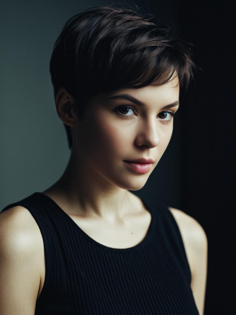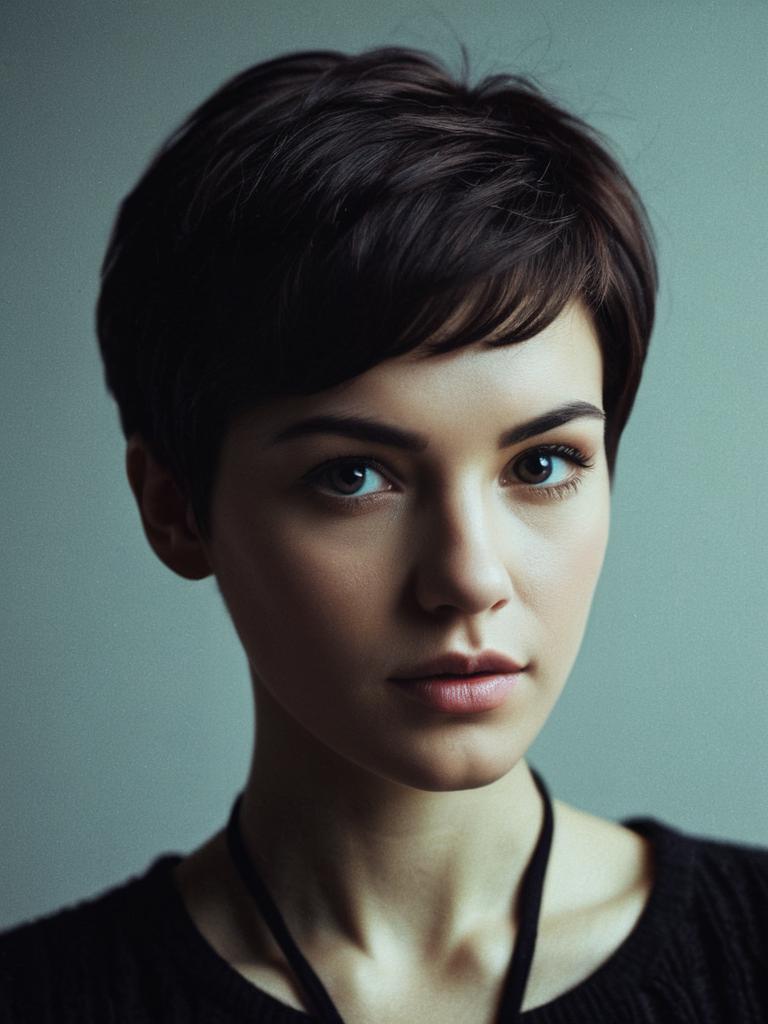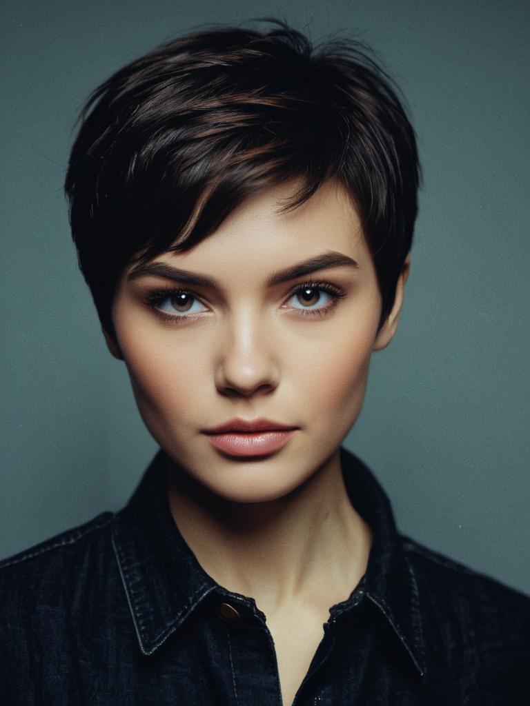 Woman with Dark Brown Pixie Cut, photorealistic fashion portrait, cinematic realism