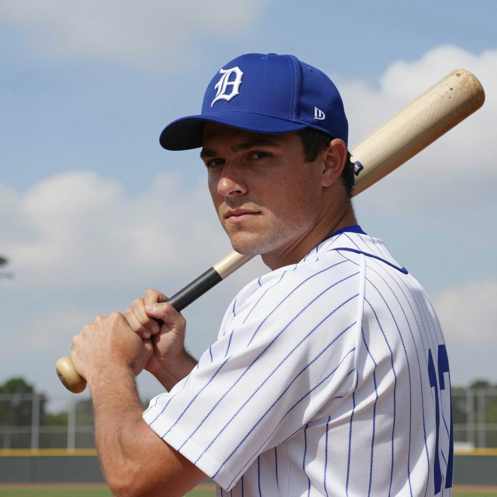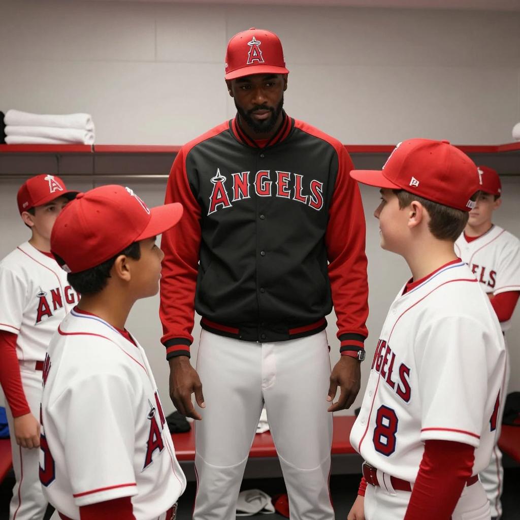 Young baseball player in white Angels uniform with "ANGELS" in red letters, stands in dugout with arms outstretched, wearing a blue cap. Other players in white uniforms sit behind him, crowded stadium in background. Brightly lit, daytime setting.