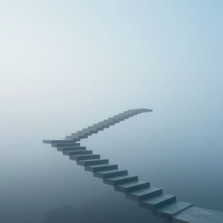 Photograph of a minimalist, floating stone staircase with sharp, clean edges, disappearing into a foggy, gradient blue background.