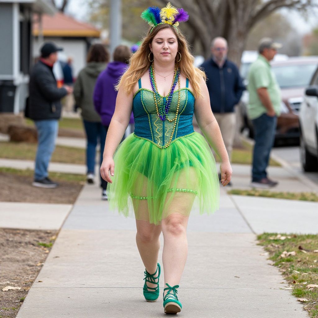 Photograph of a young woman with long blonde hair, wearing a vibrant green and blue Mardi Gras costume. She has a green corset with blue accents, a bright green tulle skirt, and green shoes. She also sports a colorful Mardi Gras headpiece with purple, yellow, and blue feathers. She walks confidently down a sidewalk in an outdoor neighborhood setting, with blurred background figures including men and women dressed in casual attire. The scene is brightly lit with natural daylight, and the sidewalk is bordered by grass and trees. The overall atmosphere is festive and lively.