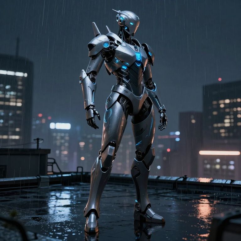 CGI image of a sleek, silver humanoid robot standing on a wet rooftop at night. The robot has a shiny, metallic body with blue glowing accents on its chest and joints. Rain is falling, creating reflective puddles on the rooftop. The background features a cityscape with blurred, illuminated buildings and neon lights. The robot stands with a confident, upright posture, its design resembling a futuristic, cybernetic soldier. The overall color palette includes dark blues and silvers, enhancing the futuristic, rainy night atmosphere.