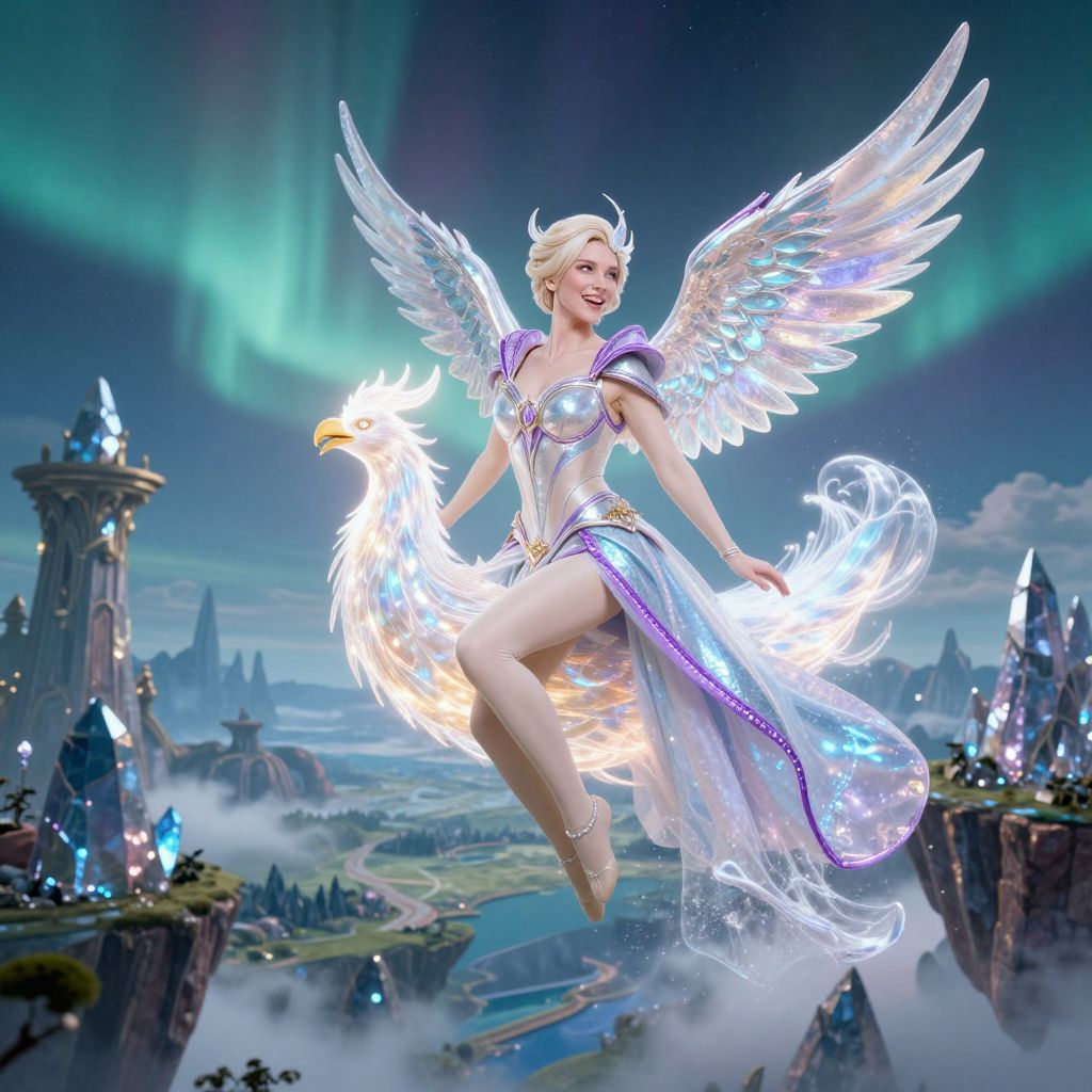 Photography of Giselle in her enchanted costume as she rides a glowing phoenix through a floating island with crystal mountains. She has smooth ivory skin, high cheekbones, and a determined yet joyful expression. Her costume is tailored with enchanted elements—shimmery wings attached to her back, a cloak that flows like water, and glowing purple trim. The sky is filled with auroras and the background shows a vast fantasy landscape with ancient towers and misty valleys.
