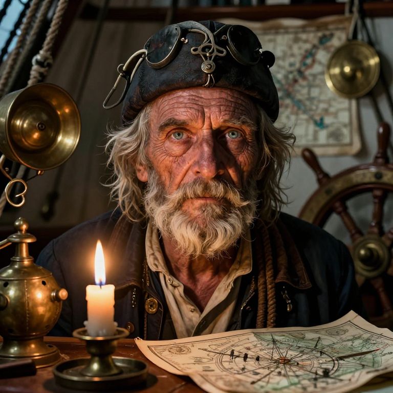 Envision a hyper-realistic portrait of an aged sea captain whose face showcases deep creases etched by years navigating treacherous seas. The warm glow of candlelight illuminates his weathered visage, casting dramatic shadows akin to tales from the high seas. His eyes, filled with adventure and enigma, reflect a life brimming with incredible experiences and untold narratives. Surrounded by polished brass instruments, a ship's wheel, and scattered nautical maps and charts, he embodies the rich tapestry of maritime history, resilience, and the indomitable spirit of exploration that defines the sea-faring life.