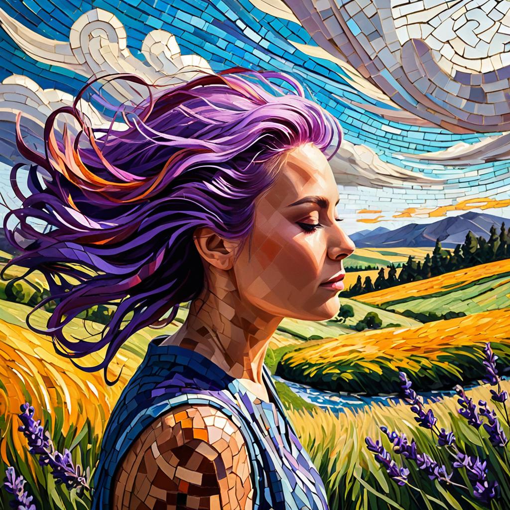 Colorful, stylized portrait of a woman with vibrant maroon hair flowing in the wind, eyes closed in a serene expression. Painted in a swirling, mosaic-like style with bold, swirling brushstrokes. Background features an abstract, dynamic landscape with wildflower meadows, under a sky with expressive, swirling clouds. Warm tones create a sense of harmony and connection to nature.