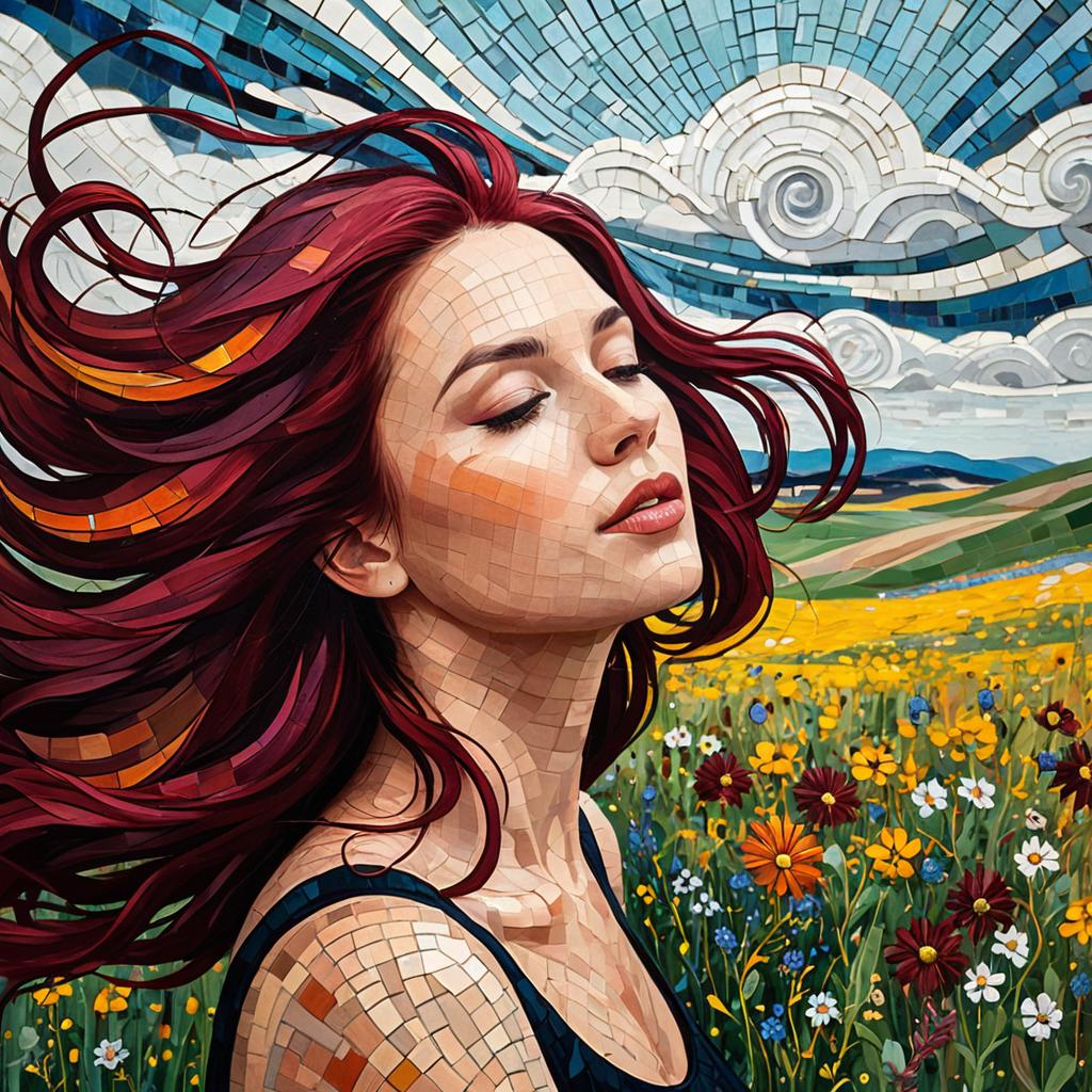 Stylized mosaic-like digital painting of a serene woman with vibrant maroon hair flowing in the wind. The woman has closed eyes and a peaceful expression, wearing a dark sleeveless top. The background features an abstract wildflower meadow with yellow, red, white, and blue flowers, rolling hills, and a dynamic sky filled with swirling clouds. The artwork uses warm, rich tones and bold swirling brushstrokes to evoke a strong sense of harmony and connection to nature.