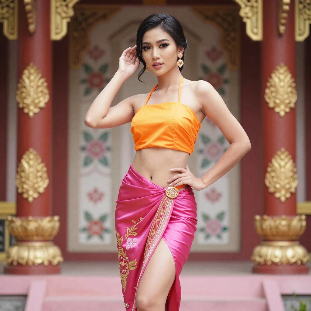 Photograph of an Asian woman with black hair, wearing an orange halter top and pink sarong with gold embroidery, standing confidently in front of an