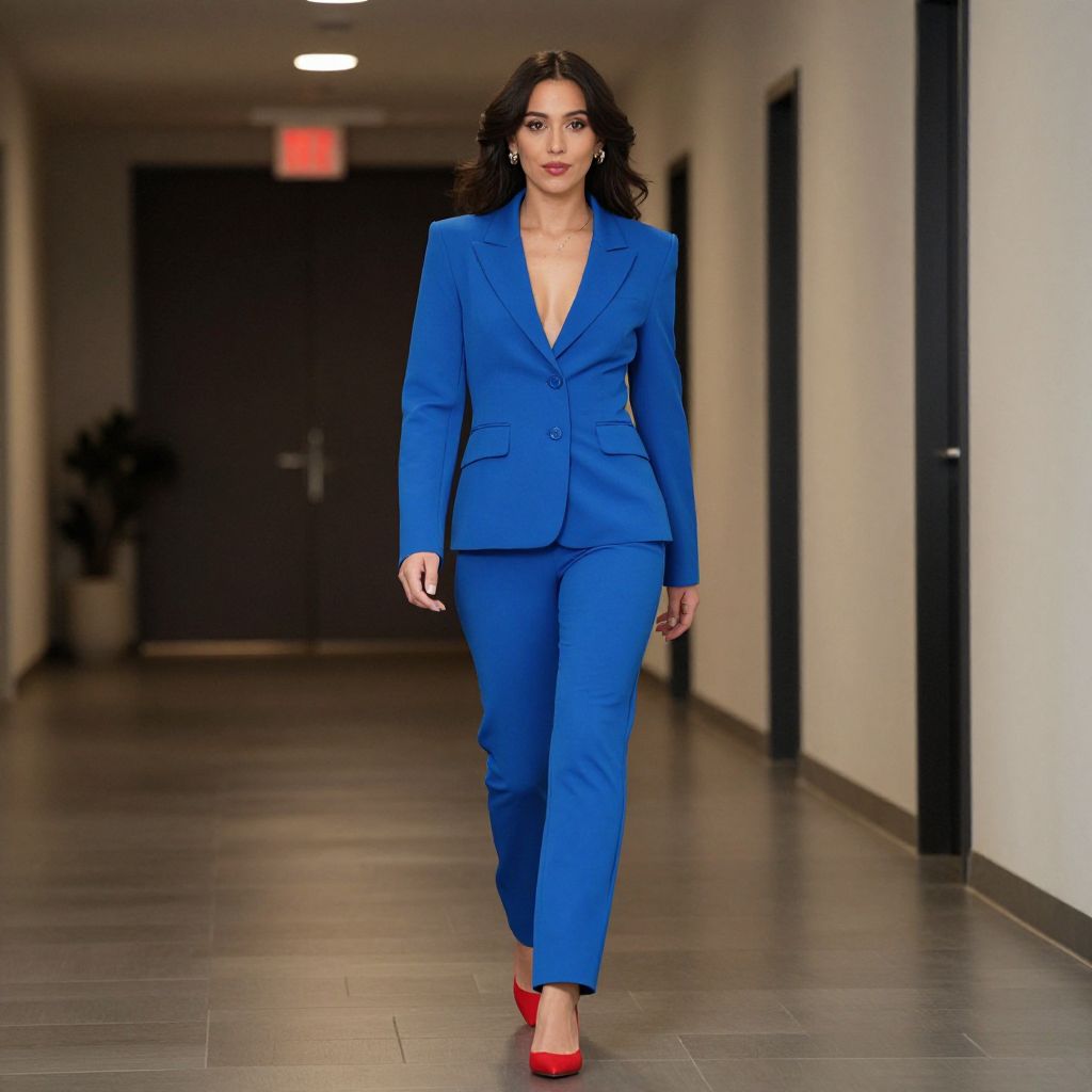 Jive Costume Female, woman in a blue suit and red shoes walking down a hall