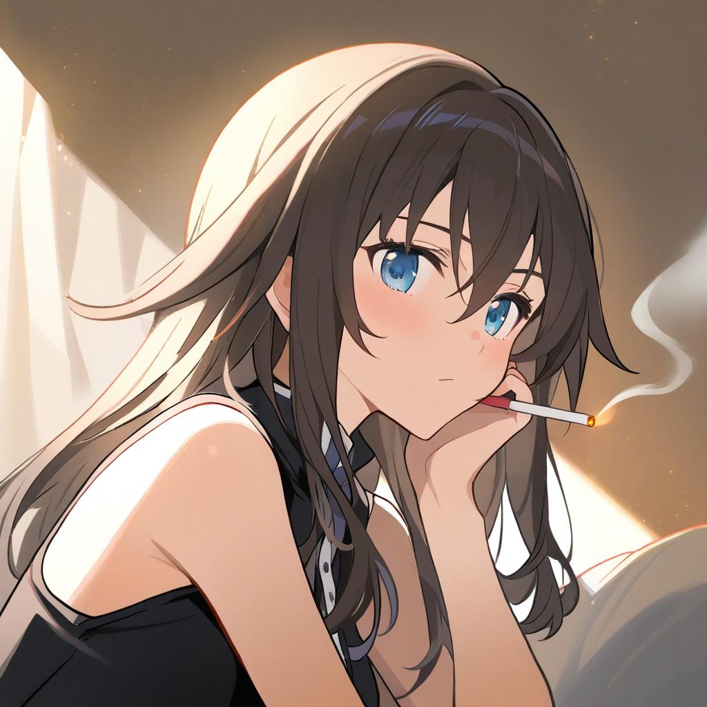 Digital illustration of an anime-style girl with long brown and black hair and blue eyes, smoking a cigarette. The character is shown in a close-up, side view with soft lighting and detailed shading, wearing a sleeveless black top.