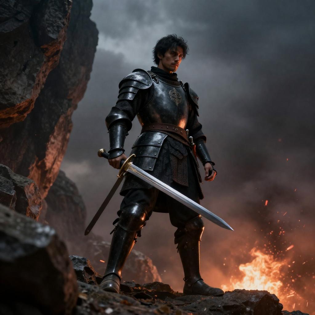 Photograph of two men in a dimly lit, medieval-style workshop. One man in black armor holds a sword to the neck of another man in brown leather armor, who is bent over a wooden table. Candles and tools in background.