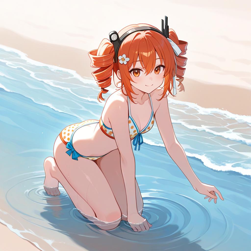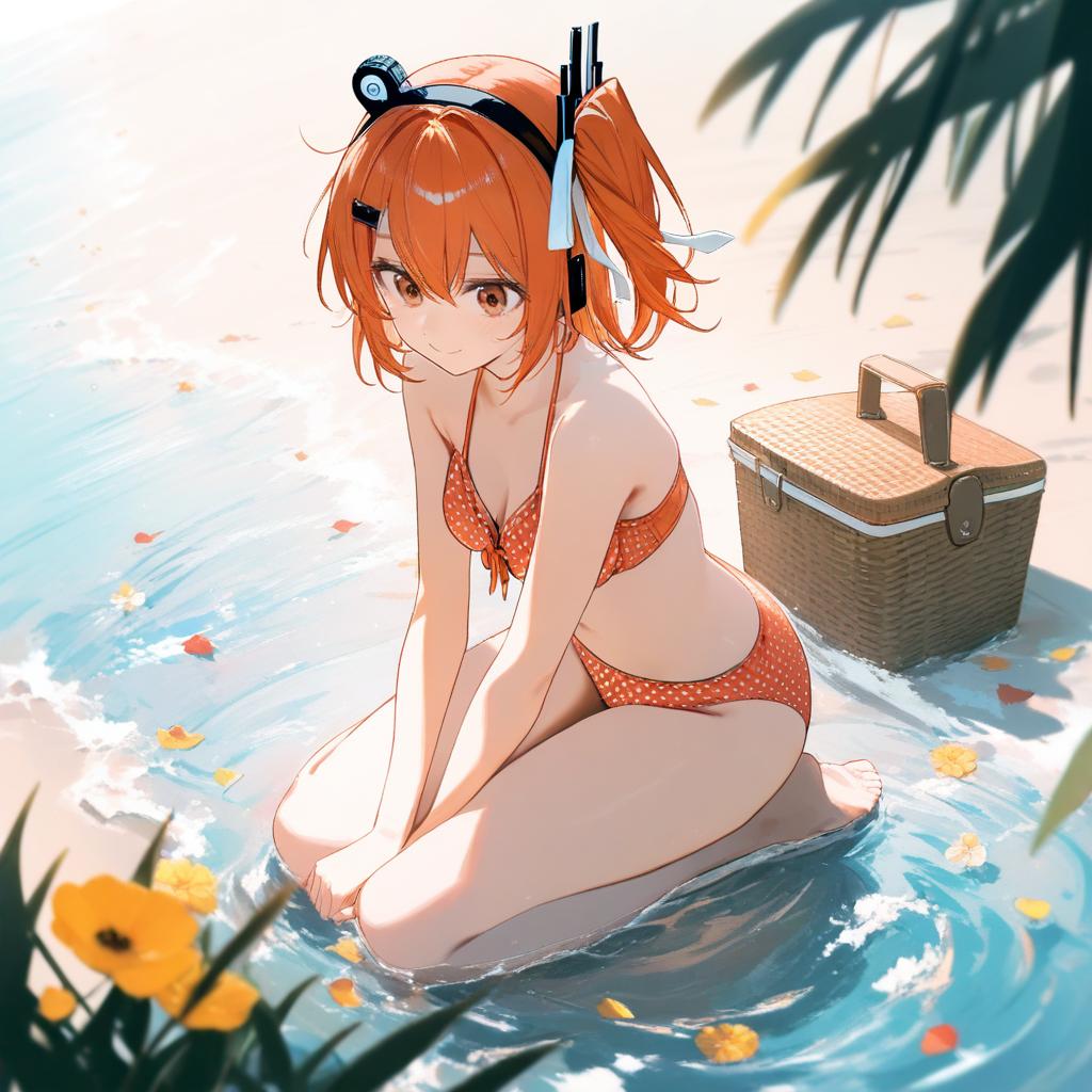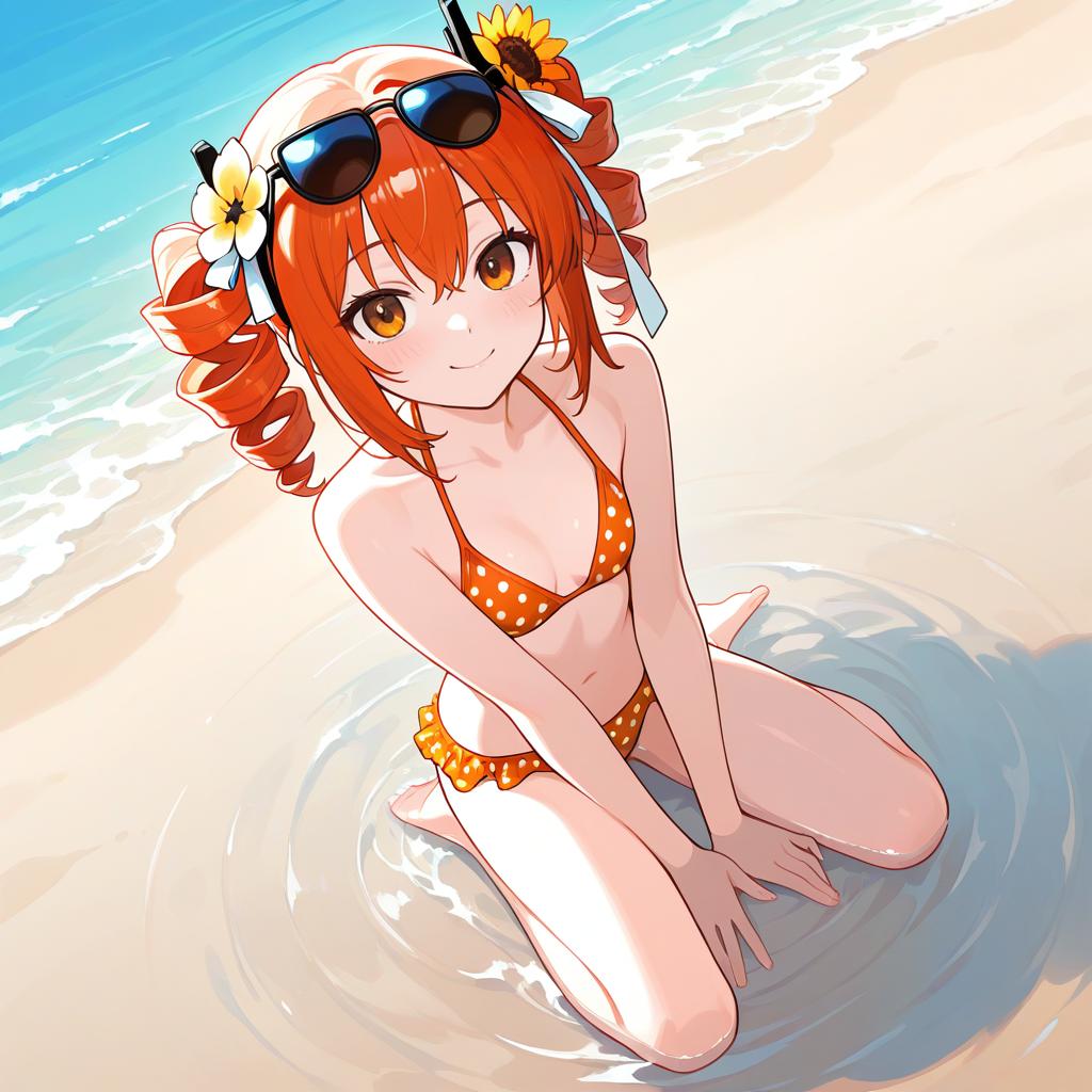 Illustration of an anime-style girl with orange hair in a white bikini with polka dots, kneeling on the sandy beach. She has red eyes, a hair ornament, and two colorful inflatable beach balls beside her. The background features a calm shoreline with gentle waves.