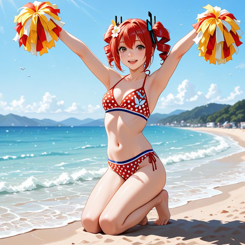Full body, adachi rei, 1girl, red hair, twin drills, red eyes, smile, polka dot bikini, flower in hair, beach setting, barefoot, enthusiastic_cheer, sunglasses, wagging, fuchsia_roses_waving