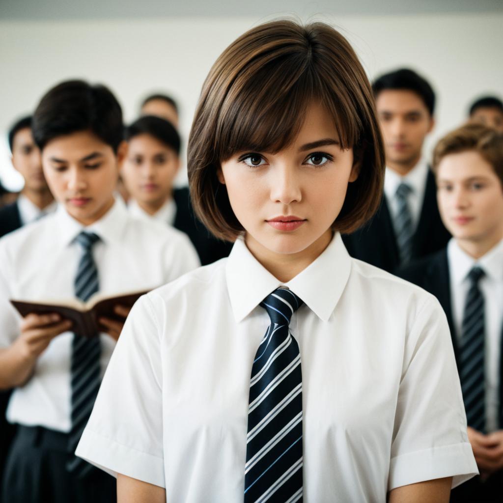 Teacher clothes,realistic, necktie, looking at viewer, blurry, school uniform, long hair, classroom, blurry background, striped necktie, brown hair, shirt, solo focus, blonde hair, photorealistic, white shirt, closed mouth, collared shirt, multiple girls, indoors, brown eyes, grey eyes, upper body, lips, k-pop, cardigan, long sleeves