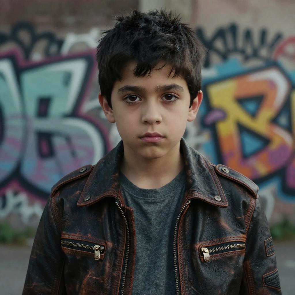 Portrait of a boy with black hair and brown eyes, wearing a vintage leather jacket, urban background with graffiti walls, moody lighting, cinematic atmosphere, photorealistic