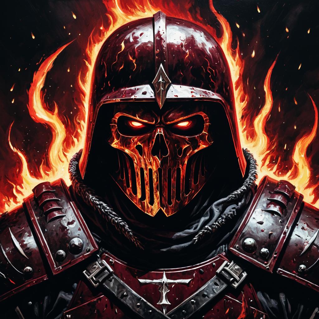 High-detail digital painting of a berserk soldier in glossy maroon armor with a flaming skull-like face, flickering flames emerging where the face should be. The soldier wears a detailed medieval-style helmet and armor, evoking intense emotions of rage and madness in a war horror style. The composition features dramatic lighting emphasizing the fiery and unsettling atmosphere.