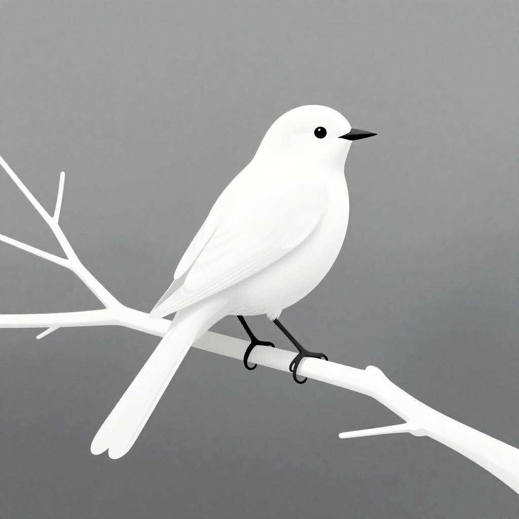 A minimalist, monochromatic digital drawing of a white bird perched on a white, leafless branch. The bird, with a sleek body and small, pointed beak, faces right. The background is a gradient of light to dark gray, adding depth. The bird's feathers are smoothly shaded, and the branches have a clean, almost skeletal appearance, creating a serene, elegant composition.