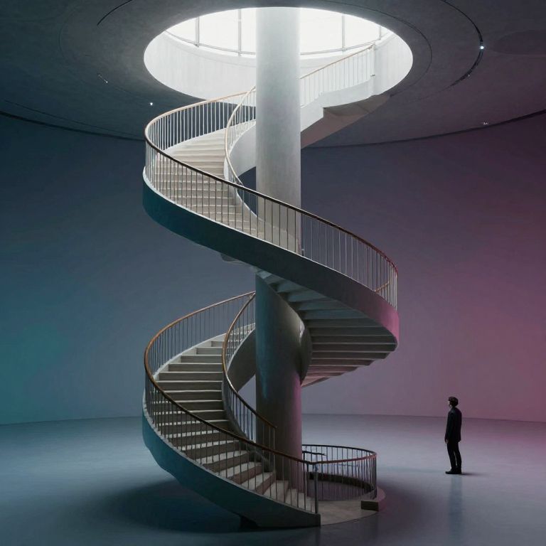 Photograph of a modern art gallery featuring a large, spiral staircase with sleek, black metal railings and wooden steps. The staircase is centered, rising from a white cylindrical column, and illuminated by a circular, glowing white light from above. The background is a gradient of blue and purple hues, creating a moody atmosphere. In the bottom right, a small, silhouetted figure stands, adding a sense of scale. The floor is smooth and reflective, enhancing the minimalist and contemporary design. The overall composition is balanced and striking, emphasizing the staircase's elegance and the gallery's modern aesthetic.