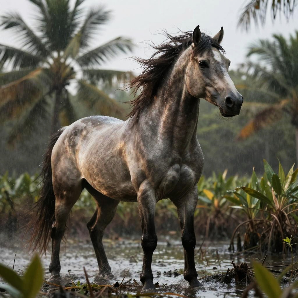 Ferocious crocodile-horse hybrid in tropical mangrove swamp in rain, hyper-detailed cinematic still, wind-whipped mane, powerful equine legs and sculptural muscles, detailed fur and sleek coat, dramatic natural light with warm highlights and deep shadows, atmospheric effects drifting snow, epic sense of scale, nuanced color palette, crisp focal point with soft background depth, ultra-detailed textures, lifelike eyes, subtle environmental storytelling elements.