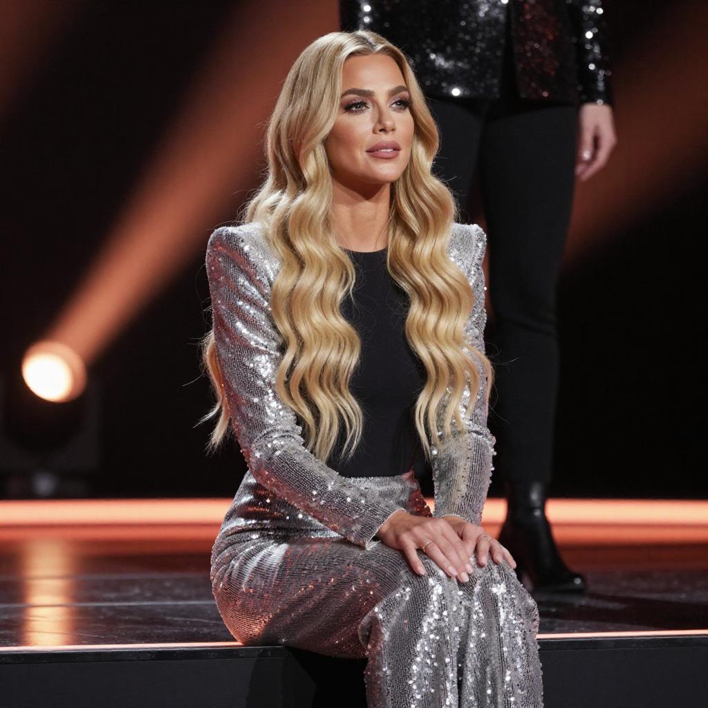 Photograph of a blonde woman with wavy hair, wearing a strapless, white, sequined dress, holding a silver trophy in her right hand, standing at a microphone on a stage. She smiles confidently, with a blurred crowd and bright orange background behind her.