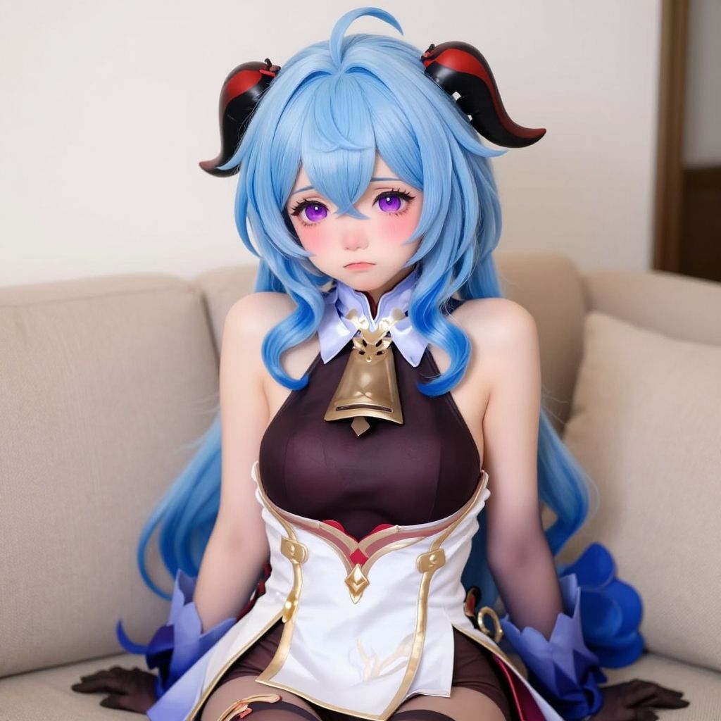 Masterpiece, best quality, 1girl, mcnsfw, (ganyu genshin impact:1.2), blue hair, purple eyes, goat horns, black bodystocking, white skirt, gold trim, sitting, blush, nervous smile, embarrassed, indoors, couch