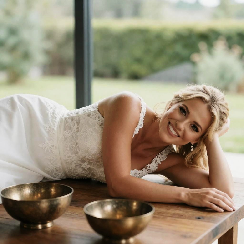 Photograph of a smiling blonde woman in a white lace wedding dress, lying on a wooden table, head resting on her hand. Glass window in background with blurred outdoor greenery. Two bronze decorative bowls in the foreground. Natural light.