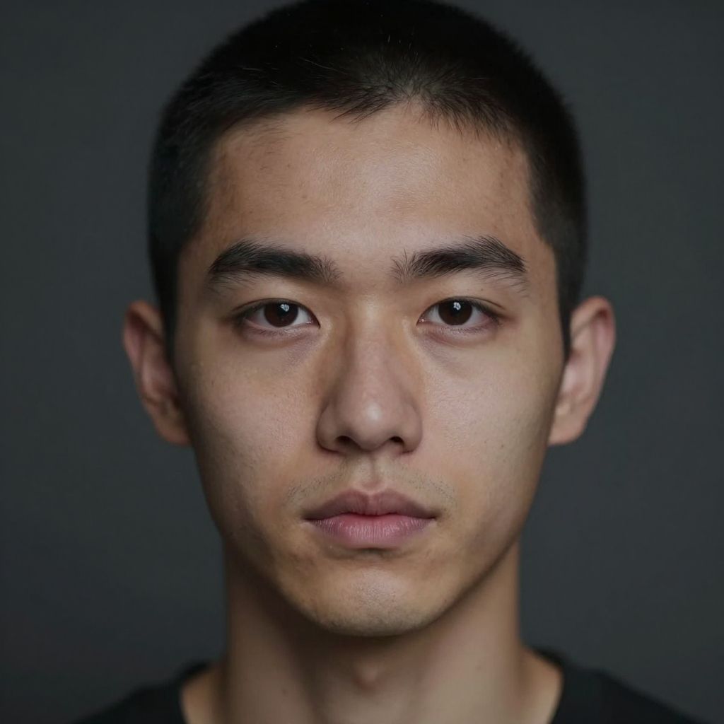 Photograph of a young Asian man with short black hair, brown eyes, and light skin, wearing a black shirt, against a dark gray background.