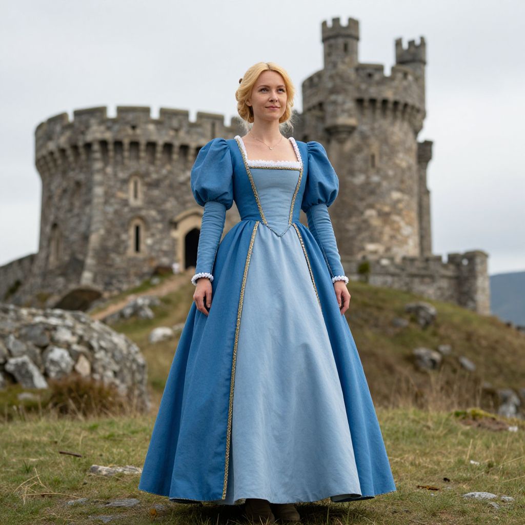 Photograph of a blonde woman standing in front of a medieval stone castle. She wears a blue, long-sleeved, puffed-sleeve dress with a square white neckline and gold trim, reminiscent of Cinderella's ball gown. Her dress contrasts with the castle's grey stone texture. The grassy field around her has patches of rocks and greenery. The castle in the background has multiple cylindrical towers with crenellations. The sky is overcast, giving a soft, diffused light to the scene. The woman's expression is calm, and she stands with her hands by her sides.