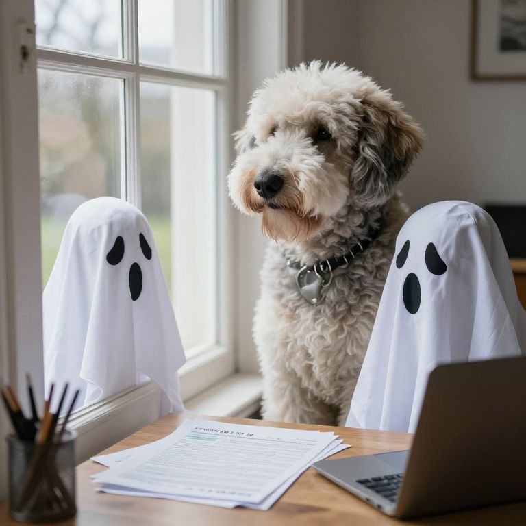 Photograph of a fluffy, white and grey, curly-haired dog sitting at a wooden table by a sunlit window. The dog wears a silver collar and gazes out the window with a happy expression. Two white ghost-shaped pillow covers with black oval eyes are on the chairs in front of the dog. A silver laptop is on the right, and a pencil holder with pencils is on the left. Papers are spread on the table. The background is a softly lit, white-walled room with a blurred view of greenery outside.