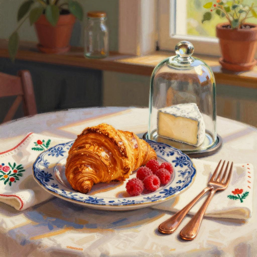 A playful, vibrant still life on a sunlit French country breakfast table, featuring blue and white porcelain plate with croissants, fresh raspberries, glass cloche with cheese, copper cutlery, embroidered napkin. Rendered in soft impressionist pastel style, with warm sunlight, soft shadows, bold color blocking, tactile textures, and a softly blurred shelf of plants and jars in the background; balanced composition, cozy domestic ambiance, shallow depth of field.