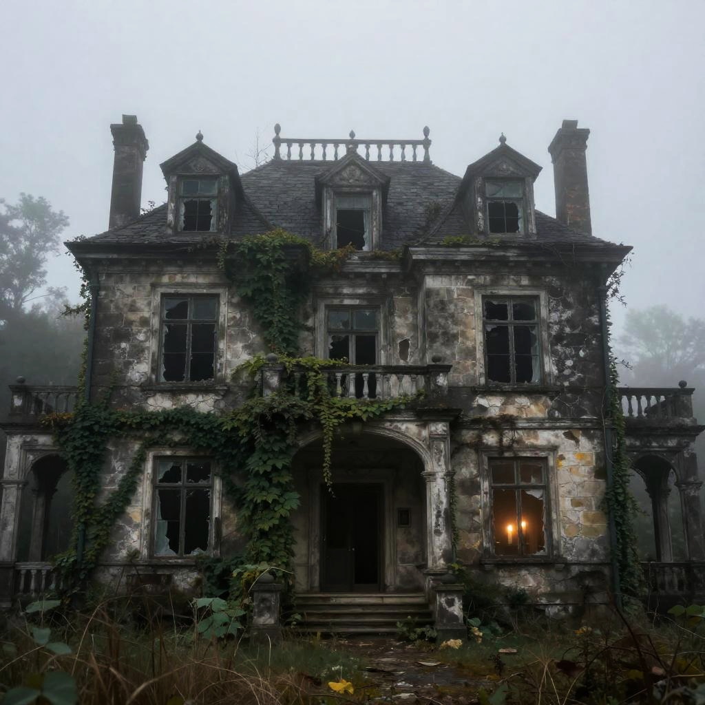 Foreboding abandoned mansion shrouded in dense fog, broken windows revealing flickering candlelight inside, overgrown vines creeping up cracked stone walls, an unsettling silence pervades the scene, detailed gothic architecture with a haunting, melancholic vibe.