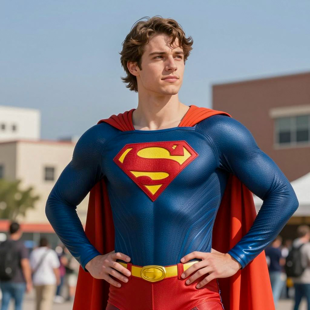 Legit superhero costume, photograph of a young man dressed as Superman, standing outdoors, daytime, wearing a red cape, blue suit with red "S" emblem, yellow belt, black gloves, and black sunglasses, short brown hair, neutral expression, blurred green foliage background, realistic style, natural light, urban setting, superhero costume, modern interpretation, vibrant colors