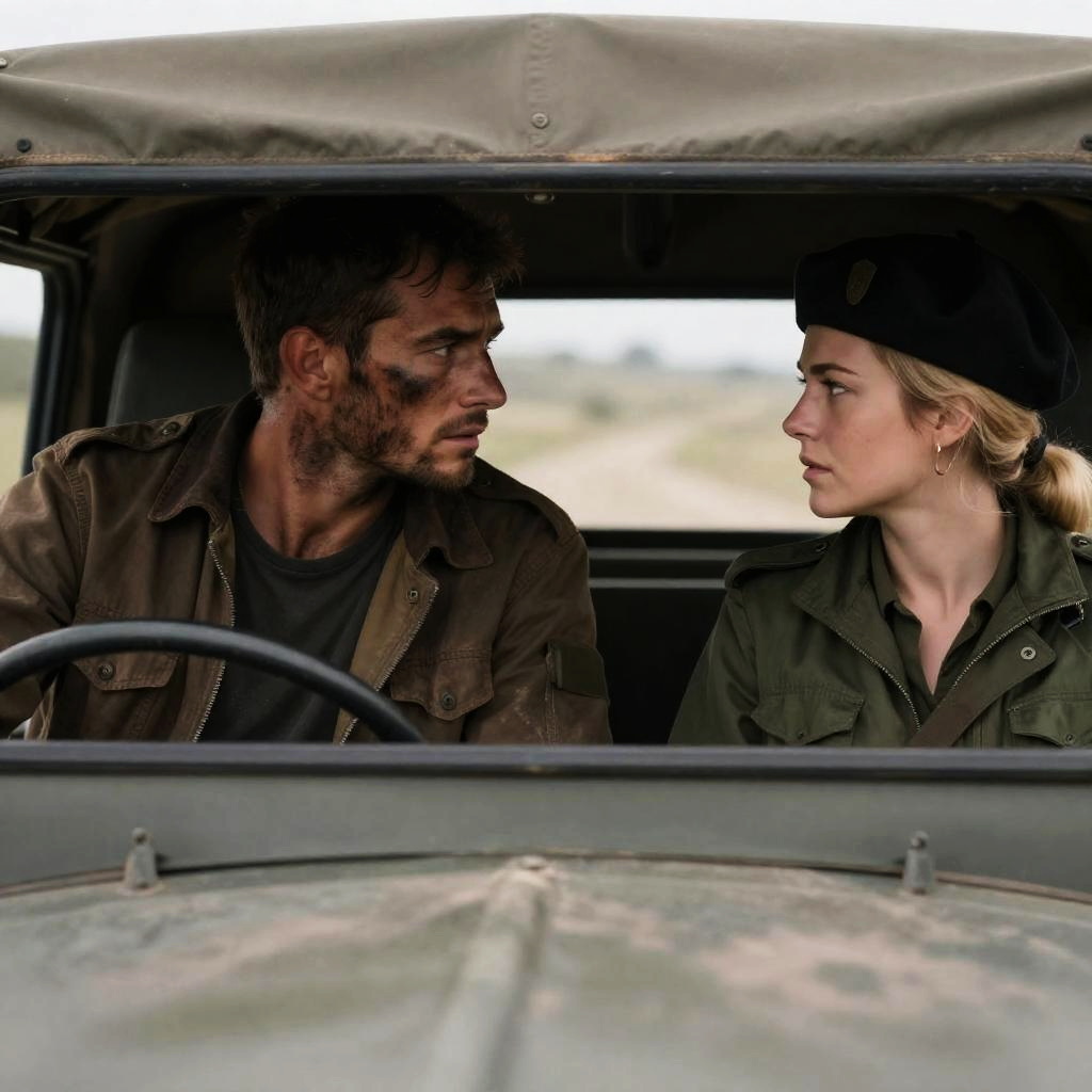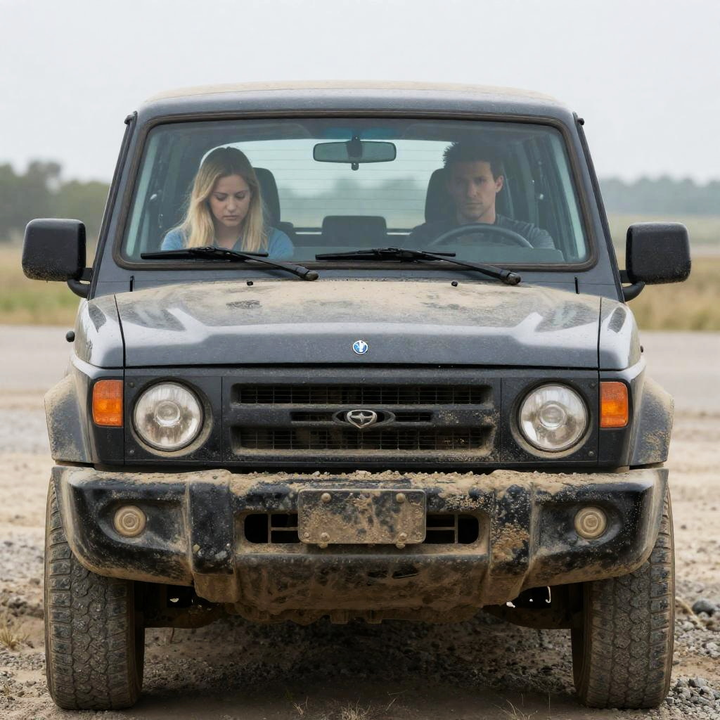Photograph of a gray, muddy SUV parked on gravel. Two people inside: a blonde woman with long hair, wearing a blue shirt, and a man with short hair, wearing a gray shirt. The woman looks down, while the man stares forward. Front view, visible headlights, and SUV grille. Gravel surrounds the vehicle.