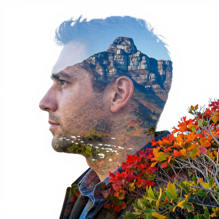 The image presents a striking double exposure of a man's profile against a backdrop of the spectacular Cape Town nature. The man's face, sharply focused, occupies the left side of the composition, with his ear and neck visible. The right side of the image is dominated by a vivid, colorful landscape that seamlessly blends with the man's profile. The landscape features a mountain range in the distance, with hues of blue and gray, and a mix of autumnal colors in the foreground, including red, orange, and green leaves. The man's jacket and shirt are visible, adding a layer of depth to the composition. The overall arrangement creates a harmonious balance between the man's profile and the natural scenery, with the man's face aligned with the mountain range, and the colorful foliage surrounding him. The image is set against a clean, white background, which enhances the contrast and makes the colors and textures of the double exposure stand out.