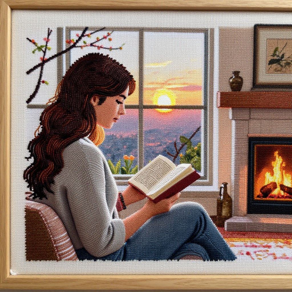 Embroidery Stitch Library dark hair woman reading book. hygge. big window. spring. sunset. fire place. photorealistic.,