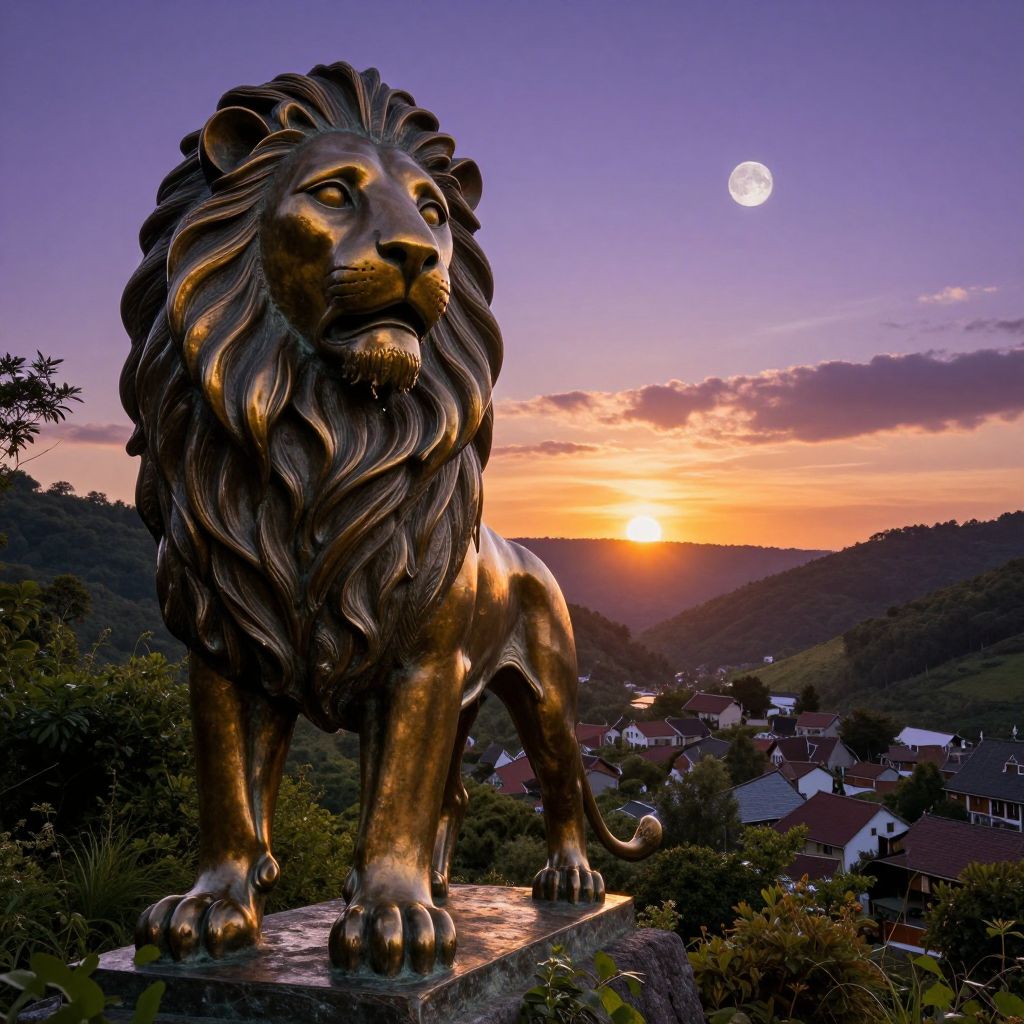 An enormous bronze statue of a majestic lion comes to life at sunset, its face morphing into a proud yet sorrowful human visage as it stands guard over a quaint village nestled in a lush valley. As twilight descends upon the landscape, the golden hues of the sun give way to rich shades of purple and indigo, casting an ethereal glow across the scene while the moon begins its ascent in the sky. The statue's once rigid form becomes fluid and graceful, with sinuous curves blending into the surrounding foliage as if it had always been part of nature itself. This captivating image captures a unique blend of fantasy and realism, eliciting a sense of both wonder and nostalgia as the lion's eyes reflect the first stars of the night sky, forever watching over its people.