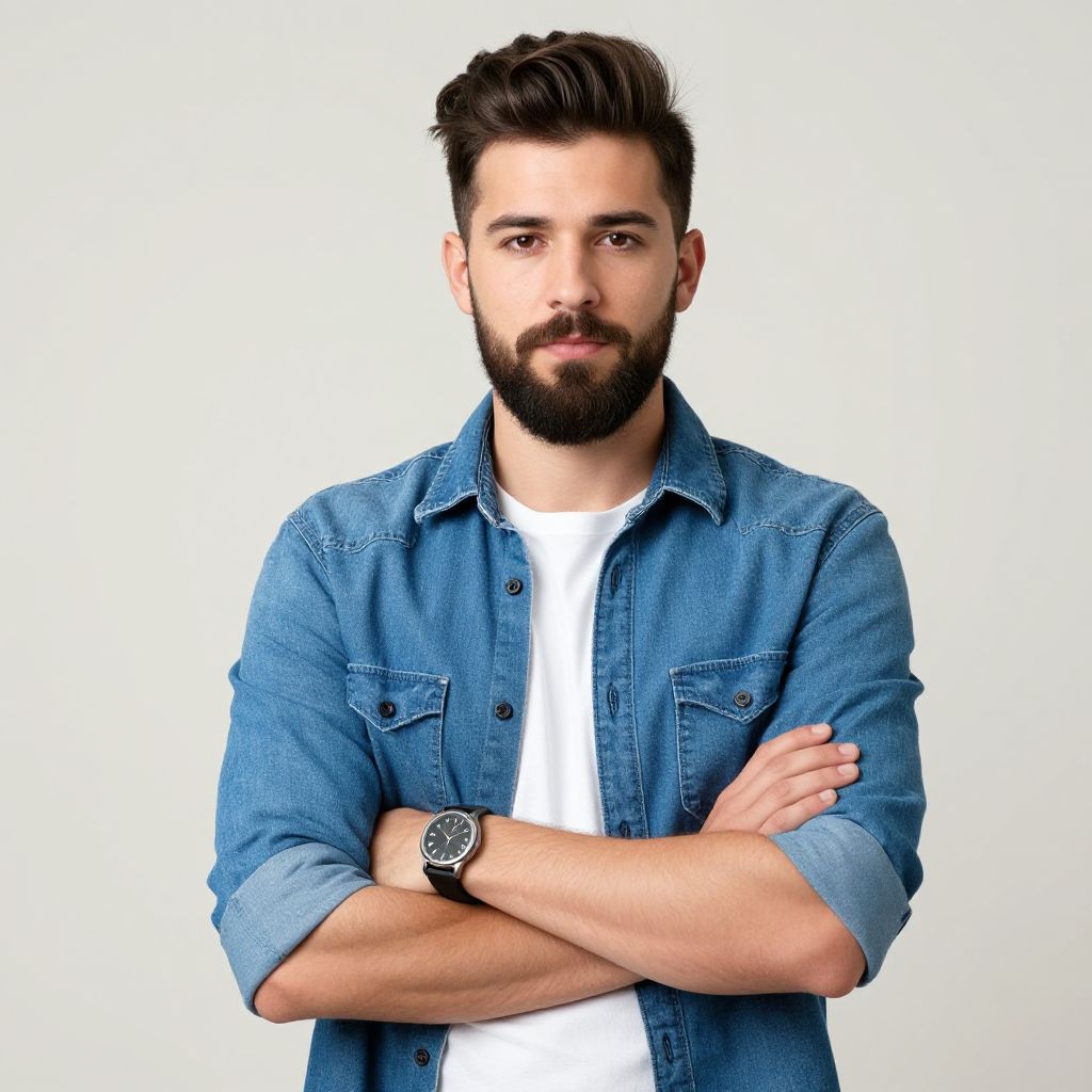 A confident young man with a full beard and neatly styled hair stands against a plain background, wearing a rolled-up denim shirt over a white t-shirt. His arms are crossed, and he sports a wristwatch, exuding a casual yet polished look.