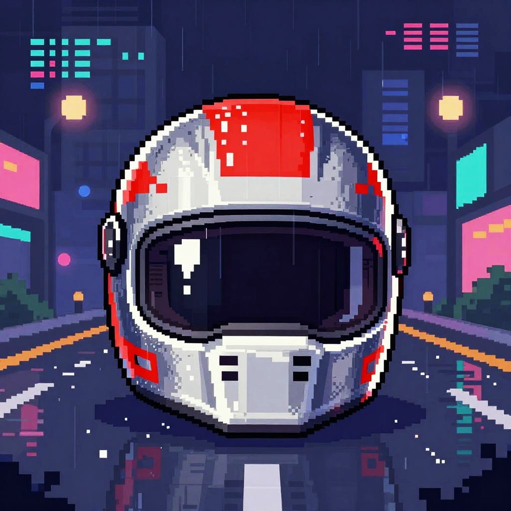 Pixel art 8-bit street racer helmet in rainy urban freeway at night, using chrome silver and neon red 16-color palette, retro 8/16-bit arcade vibe, sharp pixel edges, clean 1px outlines, deliberate checker dithering, subtle CRT bloom and scanlines, layered parallax tiles, soft pastel haze, tiny HUD glyphs, subpixel highlights on key features, balanced contrast, centered portrait sprite, reflections and light glints, consistent tile seams, nostalgic game intro energy