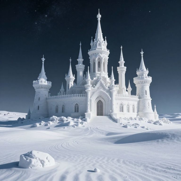 Icy moonlight bathes a surreal landscape of snow-capped castles, their intricate spires and arches sculpted by unseen hands, standing serenely amidst rippling snow dunes under a starlit sky.