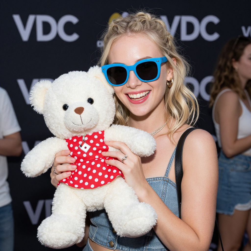 Blonde woman wearing vibrant blue sunglasses smiles brightly while holding a charming white teddy bear dressed in a red polka-dot top and skirt, showcasing her playful style at the VDC Meetup event.
