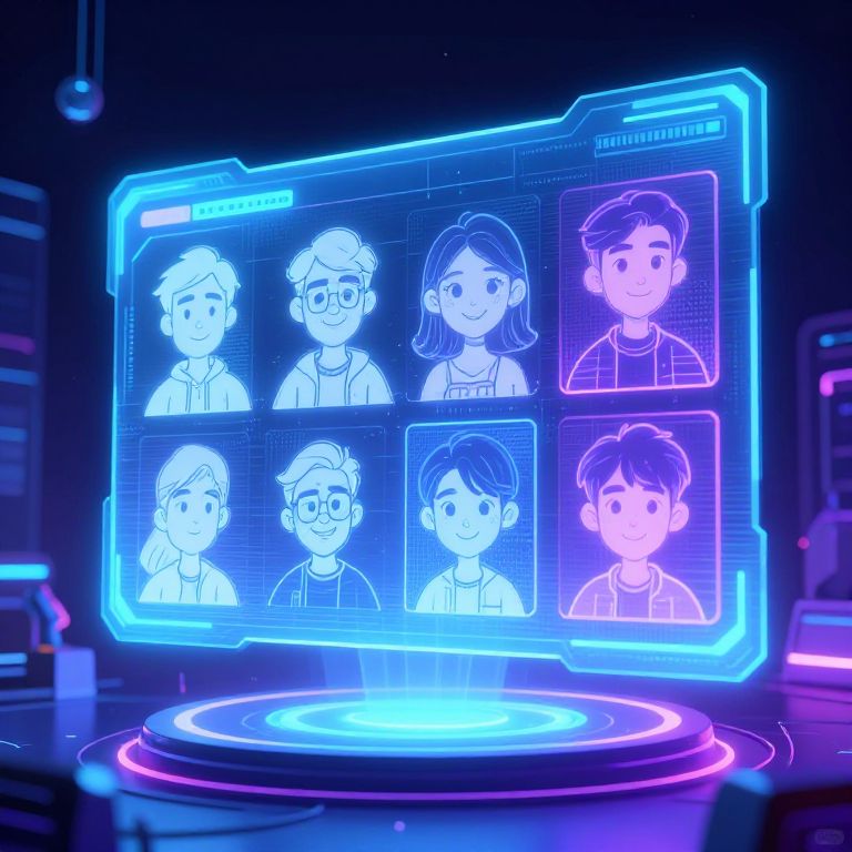 Neon-lit digital display showing eight cartoon-style child profiles with glowing blue outlines, set against a futuristic, tech-filled background.