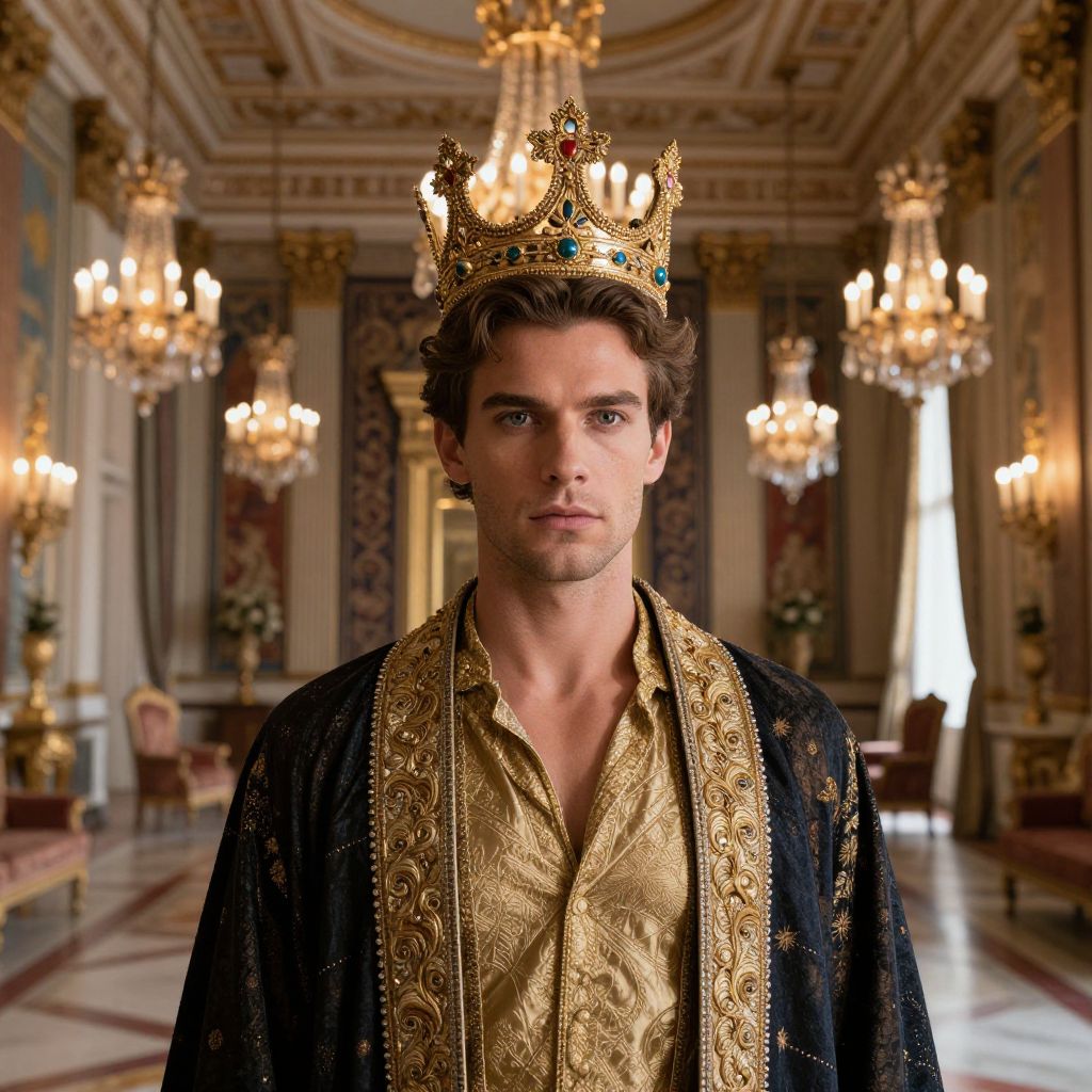 Photograph of a handsome man with wavy brown hair, wearing a golden crown and ornate black robe, standing in an opulent, chandelier